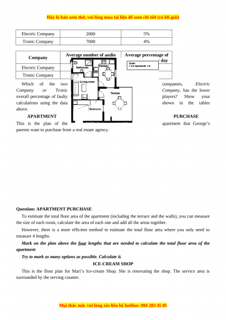 Electric Company 2000 5% Tronic Company 7000 4% Average number of audio Average percentage of Company players made per day faulty players per day Electric Company 6000 3% Tronic Company 1000 2% Which of the two companies, Electric Company or Tronic Company, has the lower overall percentage of faulty players? Show your calculations using the data shown in the tables above. APARTMENT PURCHASE This is the plan of the apartment that George’s