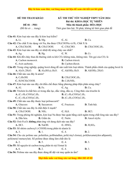 Bài thi: KHOA HỌC TỰ NHIÊN ĐỀ 01 – PH1