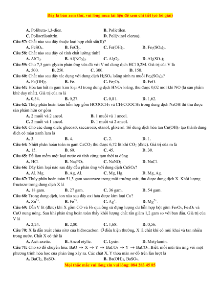 Câu 62: Thủy phân hoàn toàn hỗn hợp gồm HCOOCH3 và CH3COOCH3 trong dung dịch NaOH thì thu được sản phẩm hữu cơ gồm