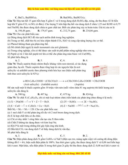 Câu 71: Cho sơ đồ chuyển hóa: BaO → X → Y → BaCO3 → Y → BaCO3. Biết: mỗi mũi tên ứng với một