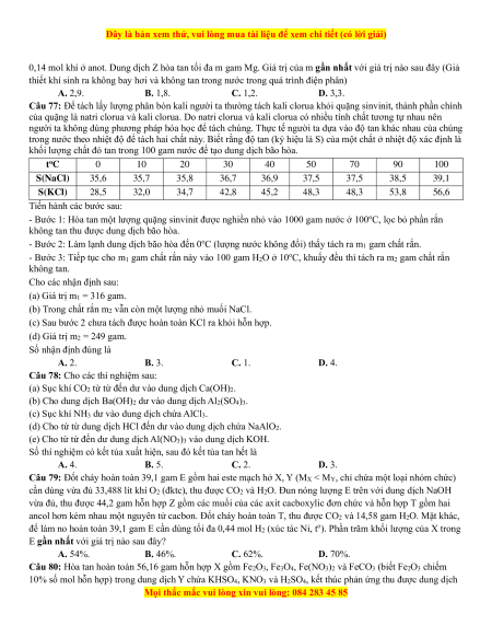 Câu 77: Để tách lấy lượng phân bón kali người ta thường tách kali clorua khỏi quặng sinvinit, thành phần chính