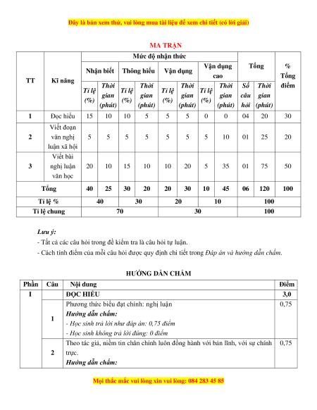 (phút) hỏi (phút) 1 Đọc hiểu 15 10 10 5 5 5 0 0 04 20 30 Viết đoạn 2 văn nghị 5 5 5 5 5 5 5 10 01 25 20 luận xã hội Viết bài 3 nghị luận 20 10 15 10 10 20 5 35 01 75 50 văn học Tổng 40 25 30 20 20 30 10 45 06 120 100 Tỉ lệ % 40 30 20 10 100 Tỉ lệ chung 70 30 100 Lưu ý: