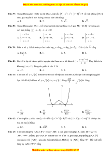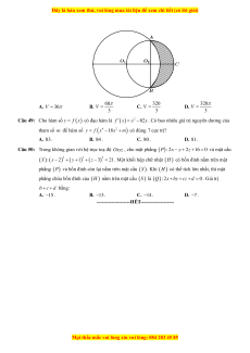 Trong không gian Oxyz, mặt phẳng ( ) : x + 2y − z +1= 0 đi qua điểm nào dưới đây? A. M ( 1 − ;0;0) B. N (0; 2 − ;0). C. P (1; 2 − ) ;1 . D. Q(1;2;− ) 1 . Câu 9: