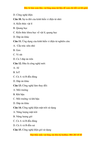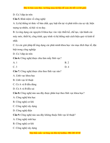 Câu 9. Công nghệ nào sau đây không thuộc lĩnh vực kĩ thuật? A. Công nghệ sinh học B. Công nghệ cơ khí C. Công nghệ xây dựng