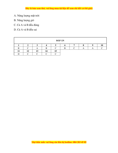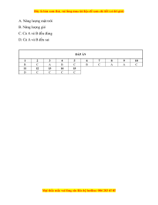 A. Năng lượng mặt trời B. Năng lượng gió C. Cả A và B đều đúng D. Cả A và B đều sai ĐÁP ÁN 1 2 3 4 5 6 7 8 9 10 B C A B C B C A A C 11 12 13 14 15 D C C C C