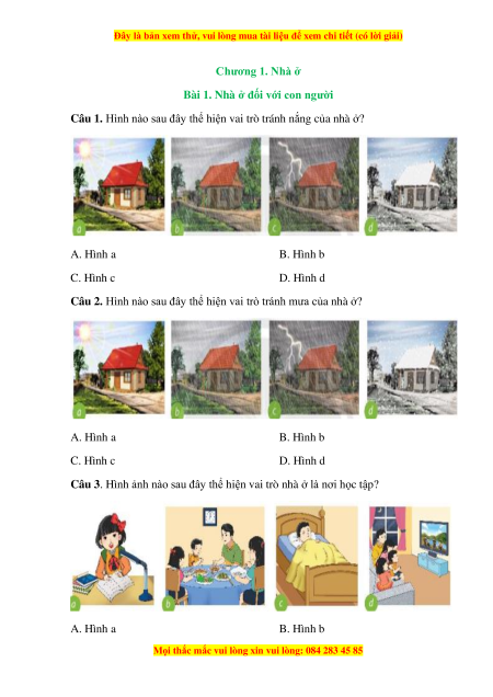 Câu 1. Hình nào sau đây thể hiện vai trò tránh nắng của nhà ở? A. Hình a B. Hình b C. Hình c D. Hình d