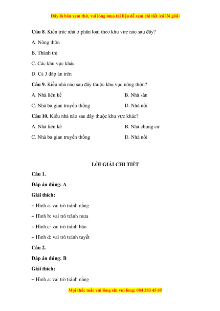 Câu 9. Kiểu nhà nào sau đây thuộc khu vực nông thôn? A. Nhà liên kế B. Nhà sàn