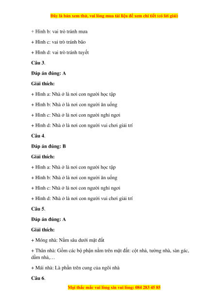 + Hình d: Nhà ở là nơi con người vui chơi giải trí Câu 4. Đáp án đúng: B Giải thích: