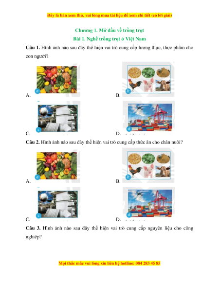 Câu 1. Hình ảnh nào sau đây thể hiện vai trò cung cấp lương thực, thực phẩm cho con người? A. B. C. D.