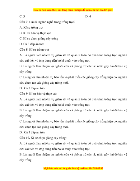 Câu 7. Đâu là ngành nghề trong trồng trọt? A. Kĩ sư trồng trọt