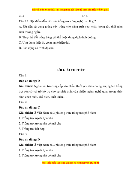 Câu 14. Trồng trọt công nghệ cao có mấy đặc điểm cơ bản? A. 1 B. 2