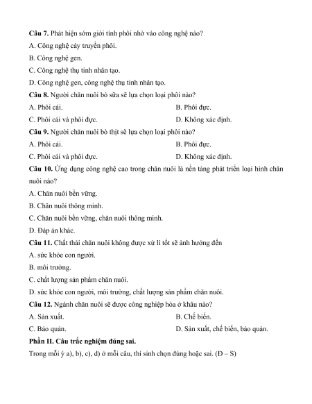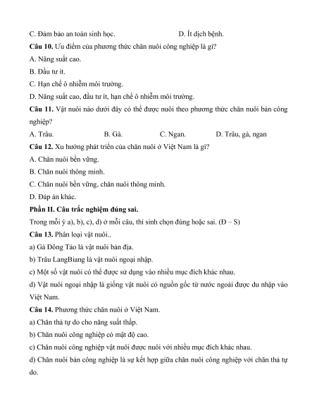 Câu 10. Ứng dụng công nghệ cao trong chăn nuôi là nền tảng phát triển loại hình chăn nuôi nào? A. Chăn nuôi bền vững. B. Chăn nuôi thông minh.