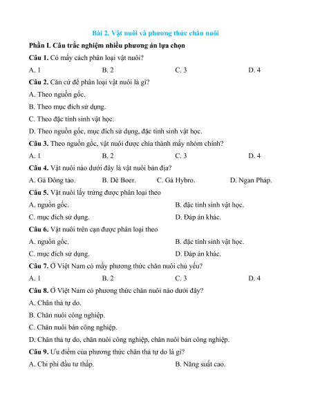 Câu 1. Có mấy cách phân loại vật nuôi? A. 1 B. 2 C. 3 D. 4