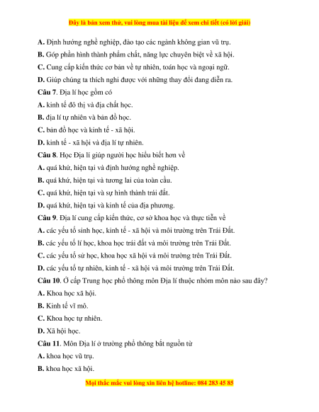 Câu 10. Ở cấp Trung học phổ thông môn Địa lí thuộc nhóm môn nào sau đây?