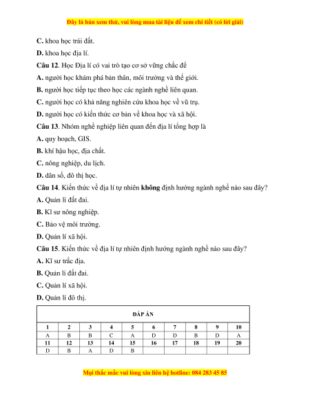 D. Quản lí đô thị. ĐÁP ÁN 1 2 3 4 5 6 7 8 9 10 A B B C A D D B D A 11 12 13 14 15 16 17 18 19 20 D B A D B