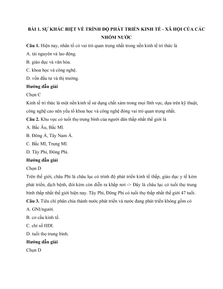 BÀI 1. SỰ KHÁC BIỆT VỀ TRÌNH ĐỘ PHÁT TRIỂN KINH TẾ - XÃ HỘI CỦA CÁC NHÓM NƯỚC