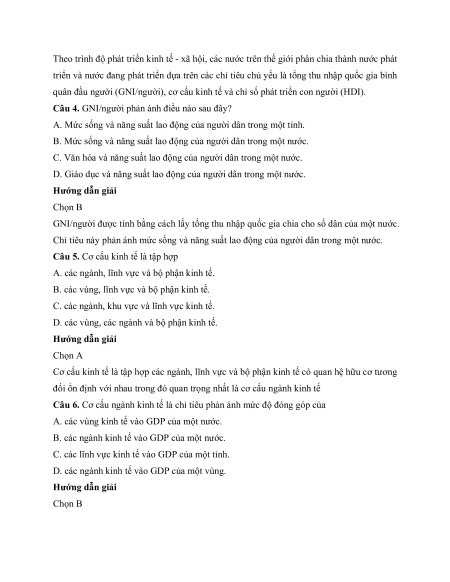 Câu 3. Tiêu chí phân chia thành nước phát triển và nước đang phát triển không gồm có A. GNI/người. B. cơ cấu kinh tế. C. chỉ số HDI. D. tuổi thọ trung bình. Hướng dẫn giải Chọn D