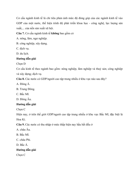 Câu 8. Các nước có GDP/người cao tập trung nhiều ở khu vực nào sau đây? A. Đông Á. B. Trung Đông. C. Bắc Mĩ. D. Đông Âu. Hướng dẫn giải Chọn C