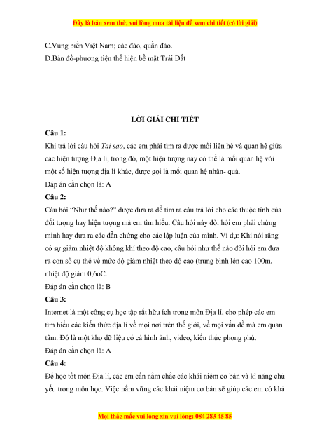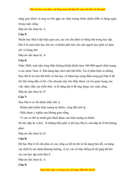 Địa lí là một môn học tìm tòi và khám phá nên yêu cầu người học phải có đam mê và hứng thú. Đáp án cần chọn là: A Câu 6: