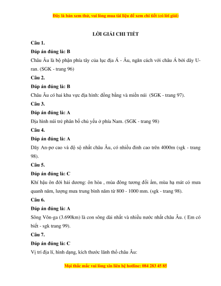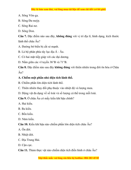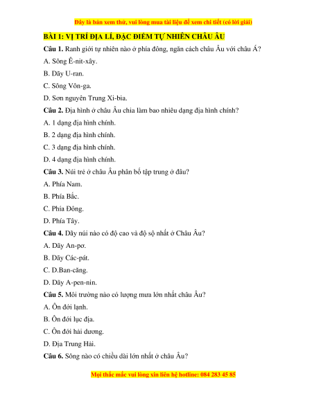 Câu 1. Ranh giới tự nhiên nào ở phía đông, ngăn cách châu Âu với châu Á? A. Sông Ê-nit-xây. B. Dãy U-ran. C. Sông Vôn-ga. D. Sơn nguyên Trung Xi-bia.