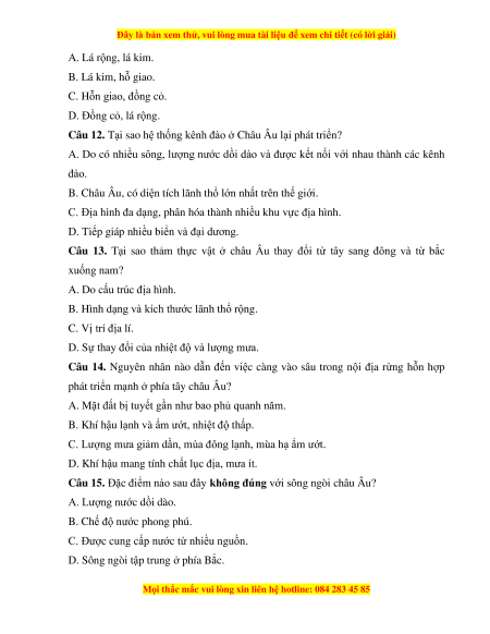 Câu 11. Thảm thực vật nào chiếm diện tích điển hình ở châu Âu?
