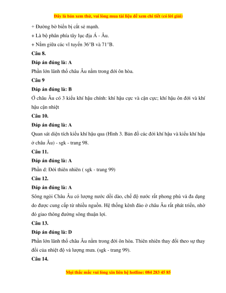 Câu 10. Kiểu khí hậu nào chiếm phần lớn diện tích châu Âu? A. Ôn đới. B. Nhiệt đới. C. Địa Trung Hải. D. Cận cực.