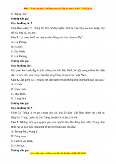 Câu 7. Hát quan họ là nét đẹp truyền thống của tỉnh nào sau đây? A. Hải Phòng. B. Hà Nội. C. Bắc Ninh. D. Hải Dương. Hướng dẫn giải Đáp án đúng là: C