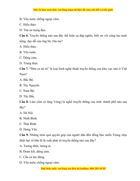 Câu 6. Truyền thống nào sau đây thể hiện sự đáp nghĩa, biết ơn với công lao nuôi