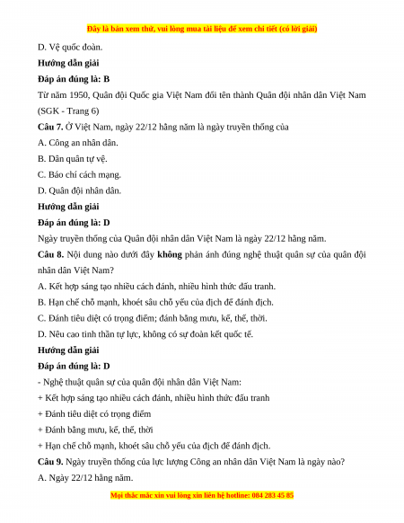 Câu 7. Ở Việt Nam, ngày 22/12 hằng năm là ngày truyền thống của A. Công an nhân dân. B. Dân quân tự vệ. C. Báo chí cách mạng. D. Quân đội nhân dân. Hướng dẫn giải Đáp án đúng là: D