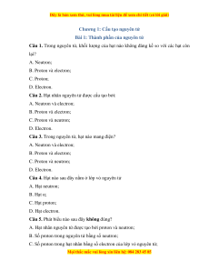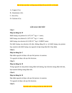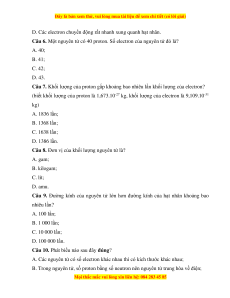 Câu 1. Trong nguyên tử, khối lượng của hạt nào không đáng kể so với các hạt còn lại? A. Neutron; B. Proton và electron; C. Proton; D. Electron.