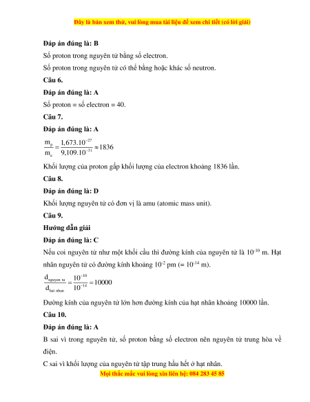 Câu 9. Đường kính của nguyên tử lớn hơn đường kính của hạt nhân khoảng bao nhiêu lần? A. 100 lần; B. 1 000 lần; C. 10 000 lần; D. 100 000 lần.