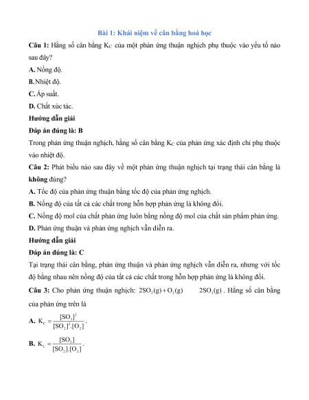 Câu 1: Hằng số cân bằng KC của một phản ứng thuận nghịch phụ thuộc vào yếu tố nào sau đây? A. Nồng độ. B.Nhiệt độ. C.Áp suất. D. Chất xúc tác. Hướng dẫn giải Đáp án đúng là: B