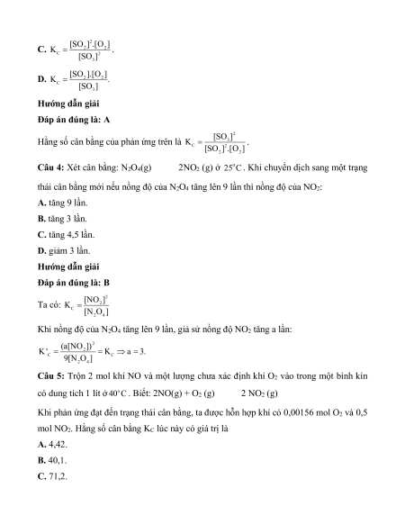 thái cân bằng mới nếu nồng độ của N2O4 tăng lên 9 lần thì nồng độ của NO2: A. tăng 9 lần. B. tăng 3 lần. C. tăng 4,5 lần. D. giảm 3 lần. Hướng dẫn giải Đáp án đúng là: B 2 Ta có: [NO ] 2 K C [N O ] 2 4