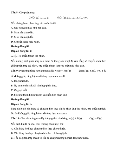 Câu 8: Cho phản ứng: 2NO 0 2 (g) (màu nâu đỏ)