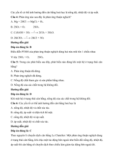 Câu 4: Phản ứng nào sau đây là phản ứng thuận nghịch? A. Mg + 2HCl → MgCl2 + H2. B. 2SO2 + O2 2SO3. C. C o t 2H5OH + 3O2 2CO2 + 3H2O. D. 2KClO o t 3 2KCl + 3O2 Hướng dẫn giải Đáp án đúng là: B