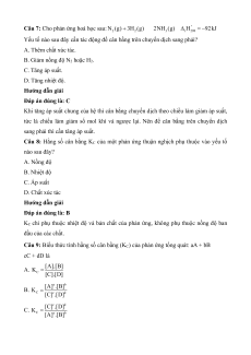 Câu 8: Hằng số cân bằng KC của một phản ứng thuận nghịch phụ thuộc vào yếu tố nào sau đây? A. Nồng độ B. Nhiệt độ C. Áp suất D. Chất xúc tác Hướng dẫn giải Đáp án đúng là: B