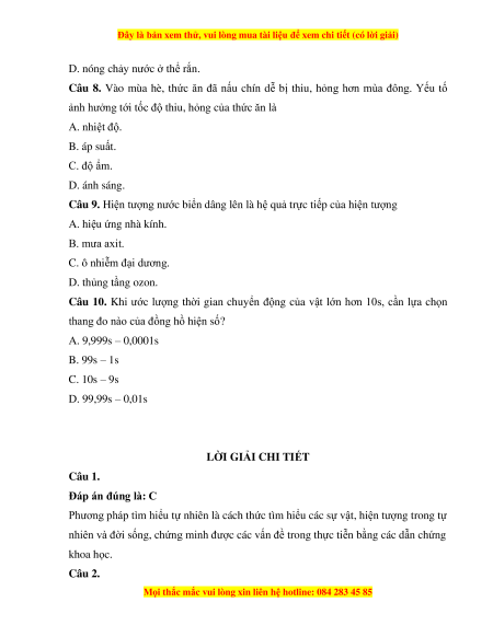 Câu 8. Vào mùa hè, thức ăn đã nấu chín dễ bị thiu, hỏng hơn mùa đông. Yếu tố