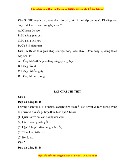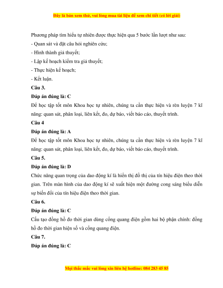 Câu 3. Để học tập tốt môn Khoa học tự nhiên, chúng ta cần thực hiện và rèn luyện bao nhiêu kĩ năng? A. 5; B. 6; C. 7; D. 8.
