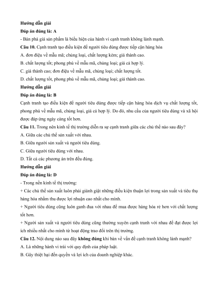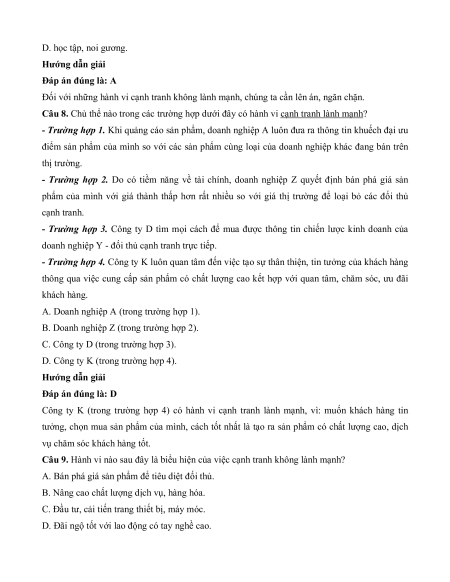 Câu 7. Đối với những hành vi cạnh tranh không lành mạnh, chúng ta cần A. khuyến khích, cổ vũ. B. lên án, ngăn chặn. C. thờ ơ, vô cảm. D. học tập, noi gương. Hướng dẫn giải Đáp án đúng là: A