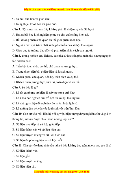 Câu 7. Nội dung nào sau đây không phải là nhiệm vụ của Sử học?