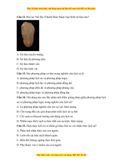 Câu 11. Căn cứ vào dạng thức tồn tại, sử liệu không bao gồm nhóm nào sau đây? A. Sử liệu thành văn. B. Sử liệu gốc.
