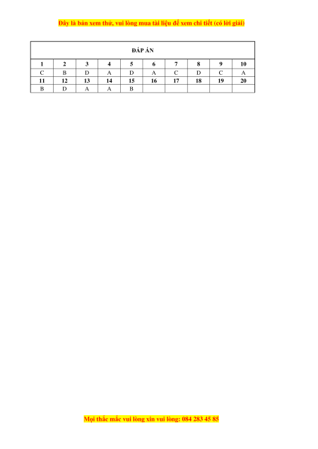 ĐÁP ÁN 1 2 3 4 5 6 7 8 9 10 C B D A D A C D C A 11 12 13 14 15 16 17 18 19 20 B D A A B