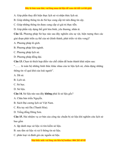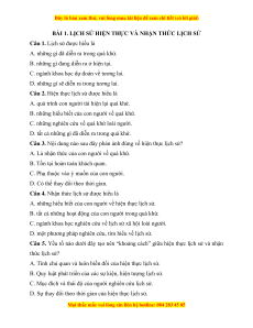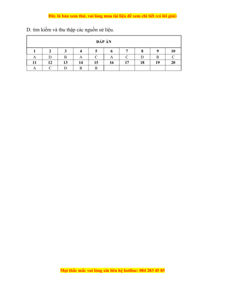 D. tìm kiếm và thu thập các nguồn sử liệu. ĐÁP ÁN 1 2 3 4 5 6 7 8 9 10 A D B A C A C D B C 11 12 13 14 15 16 17 18 19 20 A C D B B