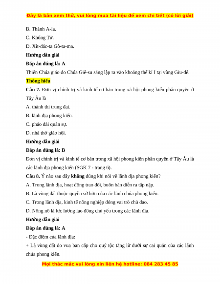 Câu 7. Đơn vị chính trị và kinh tế cơ bản trong xã hội phong kiến phân quyền ở Tây Âu là A. thành thị trung đại. B. lãnh địa phong kiến. C. pháo đài quân sự. D. nhà thờ giáo hội. Hướng dẫn giải Đáp án đúng là: B