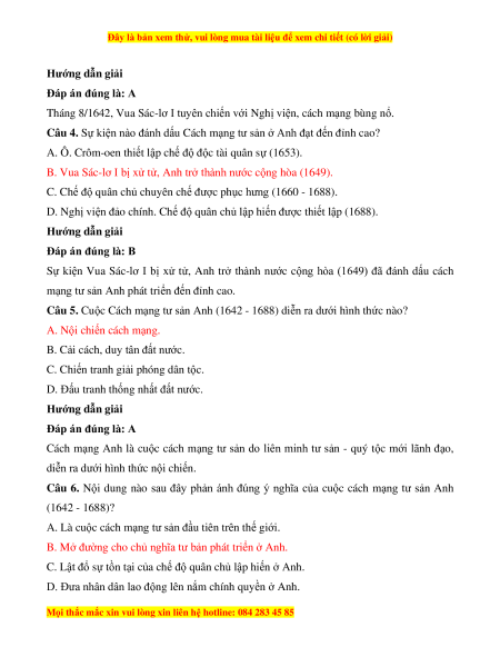 Câu 3. Cách mạng tư sản Anh bùng nổ vào thời gian nào? A. Tháng 8/1642. B. Tháng 12/1688. C. Tháng 12/1773. D. Tháng 9/1783.