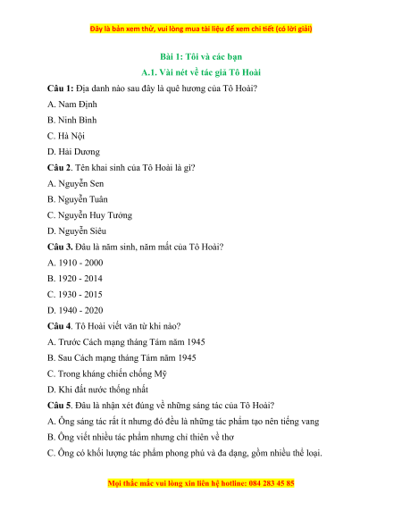 Câu 1: Địa danh nào sau đây là quê hương của Tô Hoài? A. Nam Định B. Ninh Bình C. Hà Nội D. Hải Dương