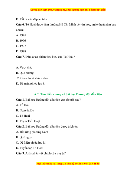 Câu 1. Bài học Đường đời đầu tiên của tác giả nào? A. Tố Hữu B. Nguyễn Du C. Tô Hoài D. Phạm Tiến Duật
