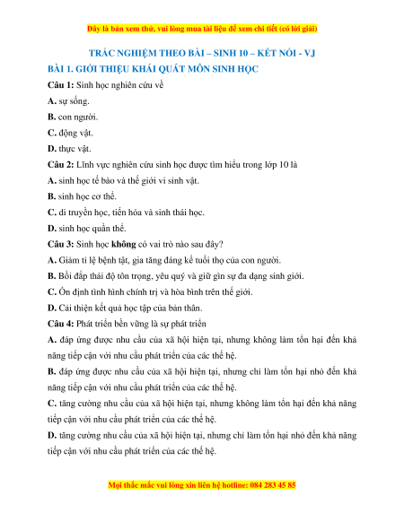 Câu 1: Sinh học nghiên cứu về A. sự sống. B. con người. C. động vật. D. thực vật.