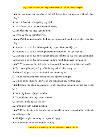 Câu 6: Phát biểu nào sau đây thể hiện vai trò của sinh học trong sự phát triển bền vững?