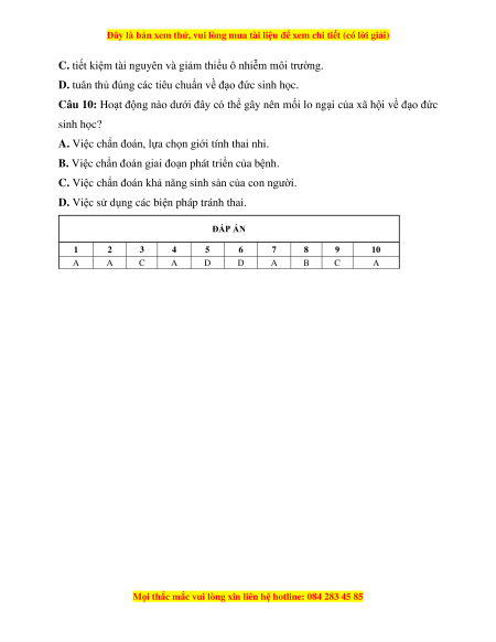 D. Việc sử dụng các biện pháp tránh thai. ĐÁP ÁN 1 2 3 4 5 6 7 8 9 10 A A C A D D A B C A